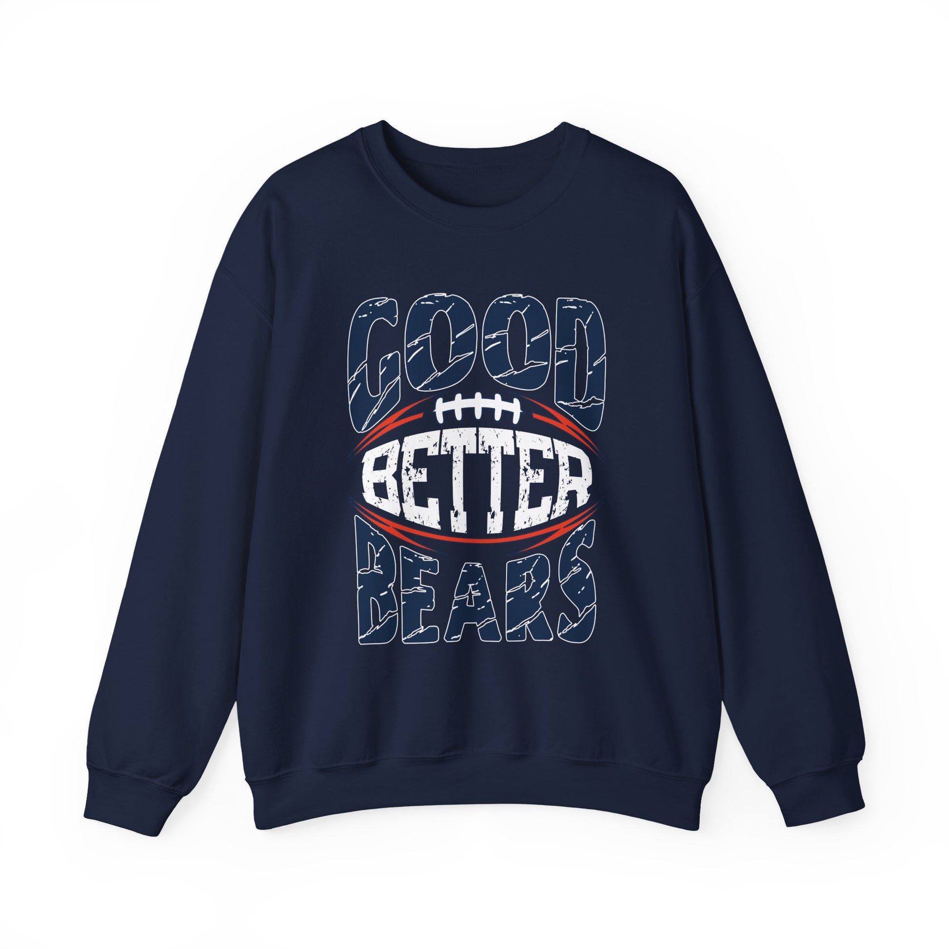 Wrap yourself in the energy of Chicago football with the “Good Better Bears” pullover. Inspired by Coach Ben Johnson’s viral postgame mantra, this sweatshirt brings the locker room chant to life in bold, stacked typography—Good, Better, Bears—with “Better” emblazoned inside a football at the center.